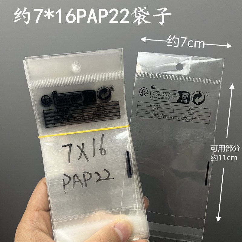 - Specifications: Approximately 7X16 transparent PAP22 bag with hanging holes